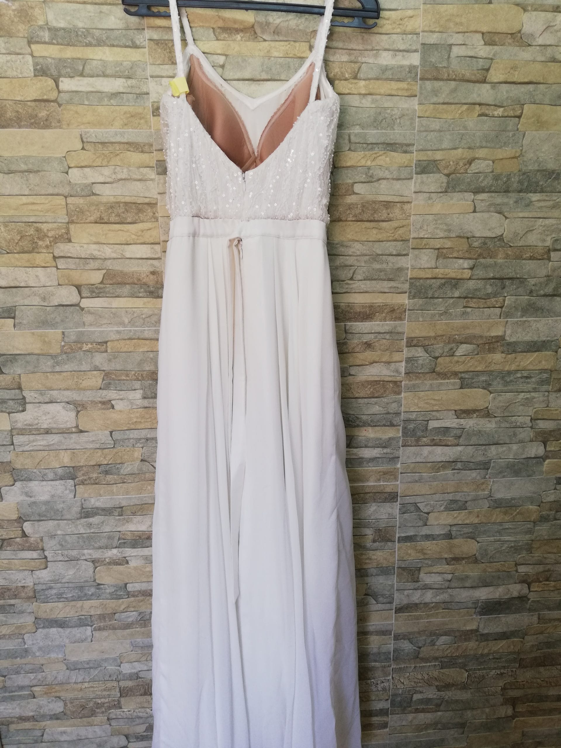 שמלה עדינה, משובצת חרוזים בחלק העליון, גב חשוף וקשירה מאחור.