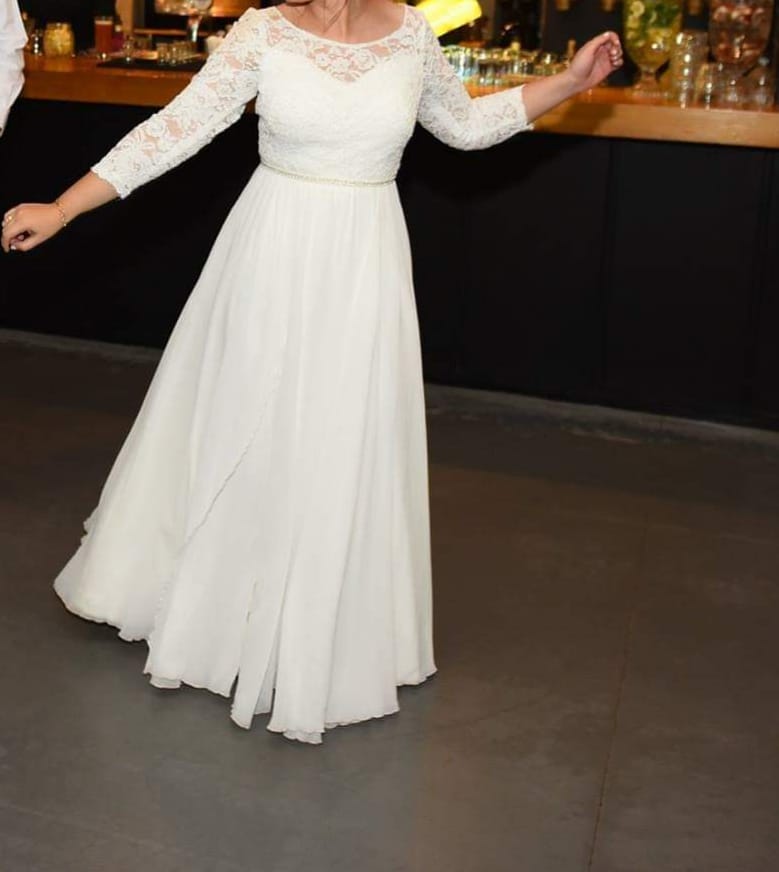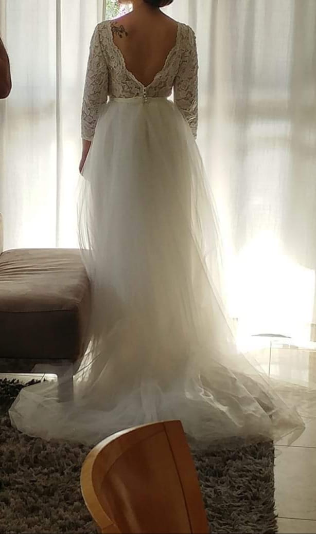 שמלת כלה בסגנון קלאסי עם גב פתוח ושרוולים תחרה משי וקאפים פנימיים מידה B .