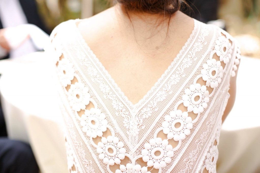 תחרה נדירה עם מחשוף משולש מקדימה ובגב.