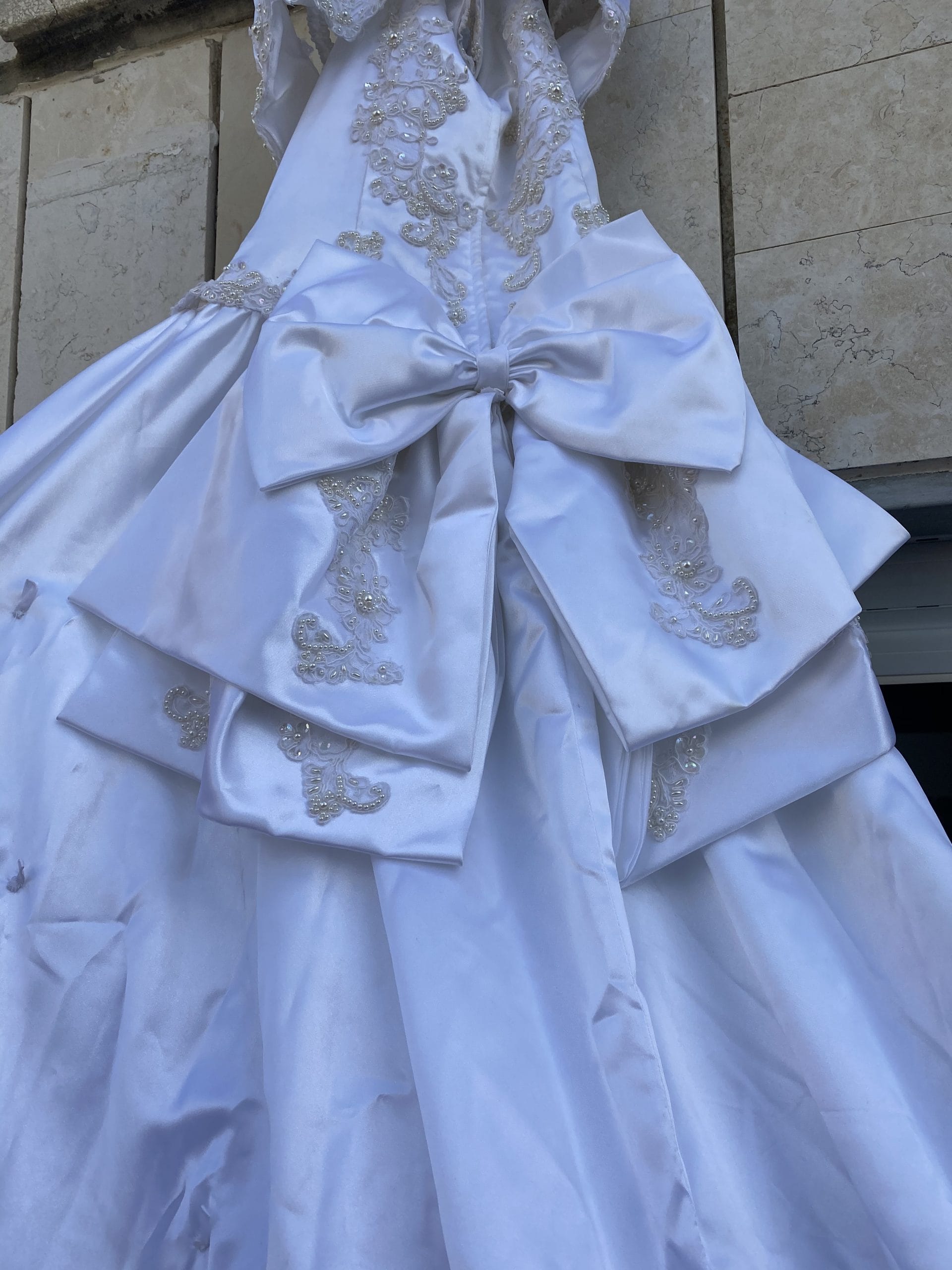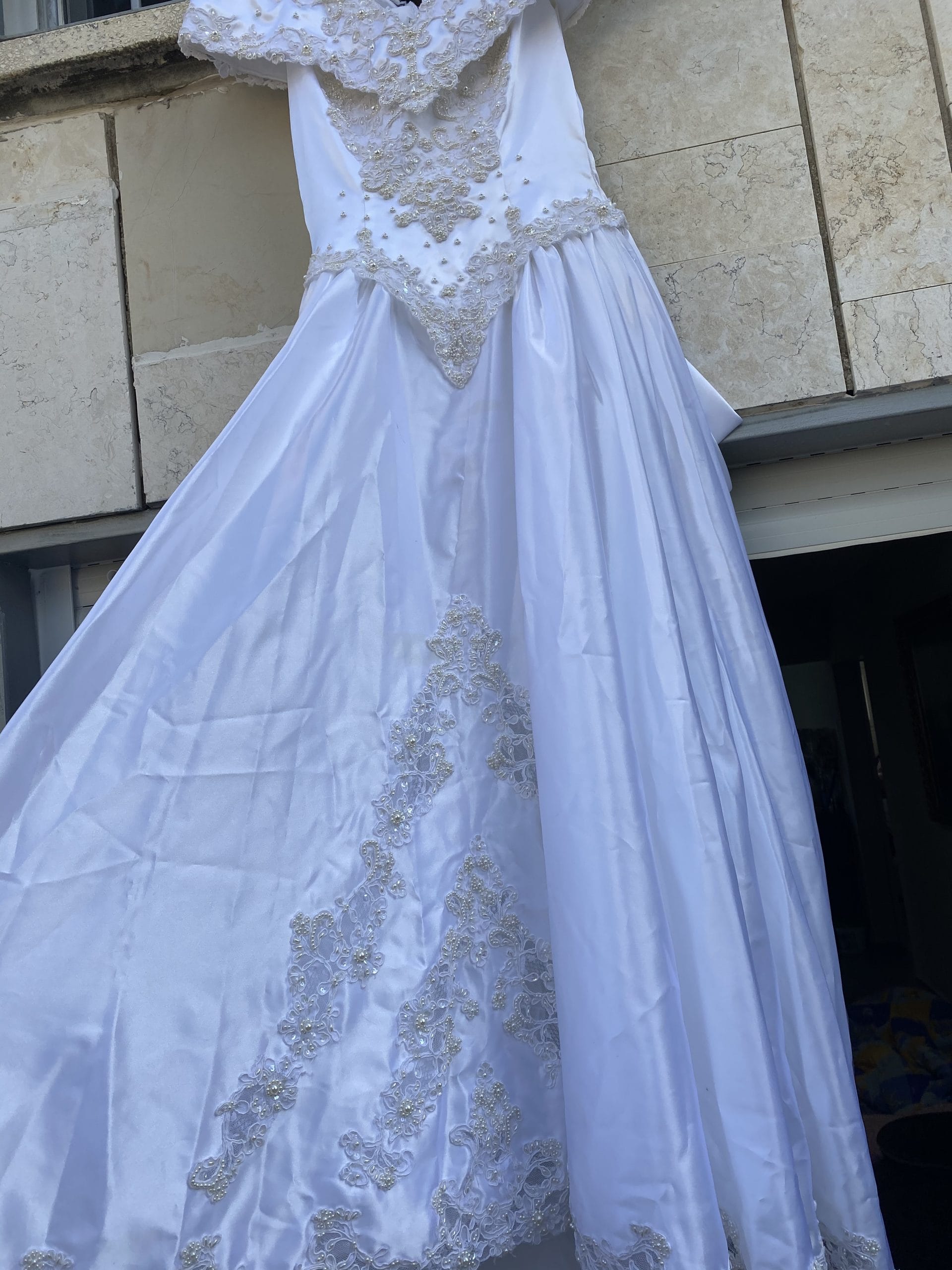 שמלת כלה סאטן בצבע לבן עם פניני זהב שתפורים עבודת יד