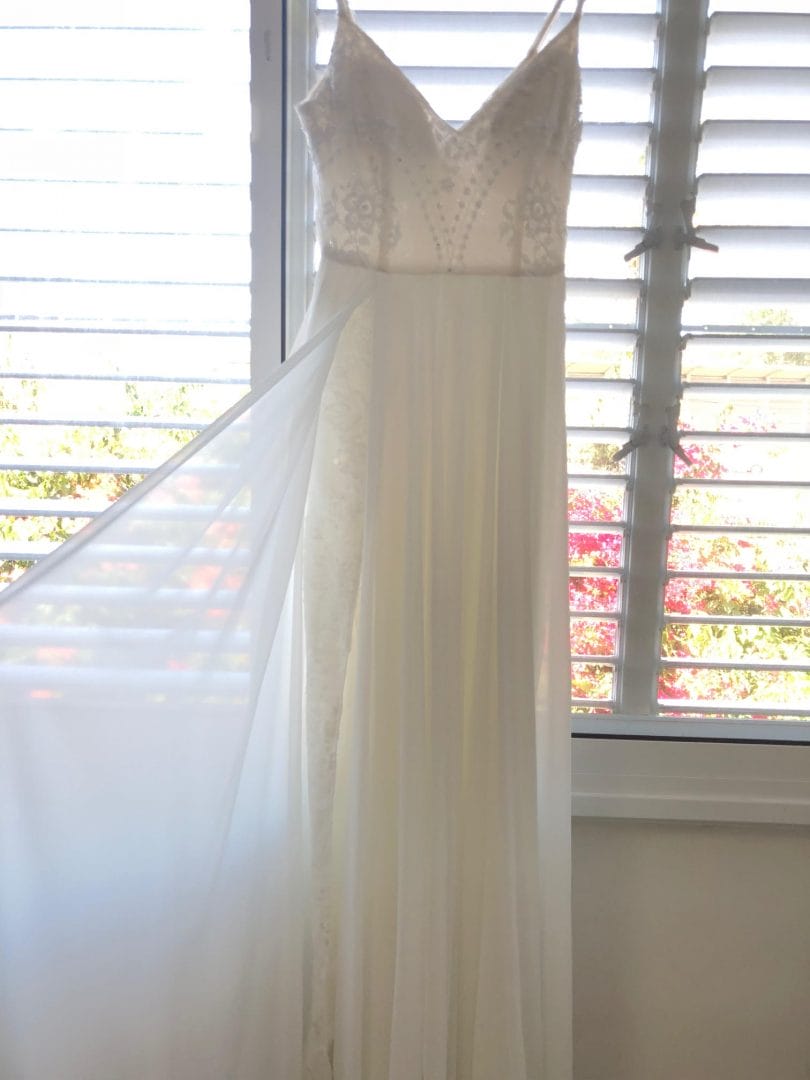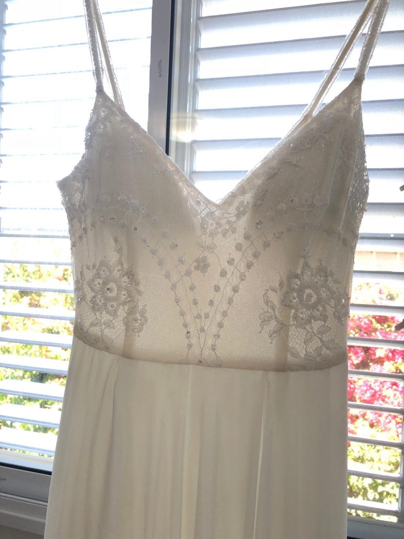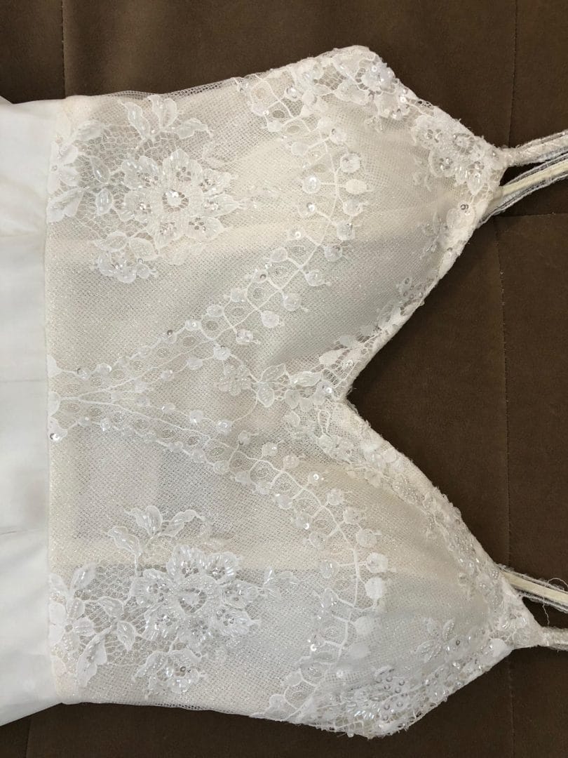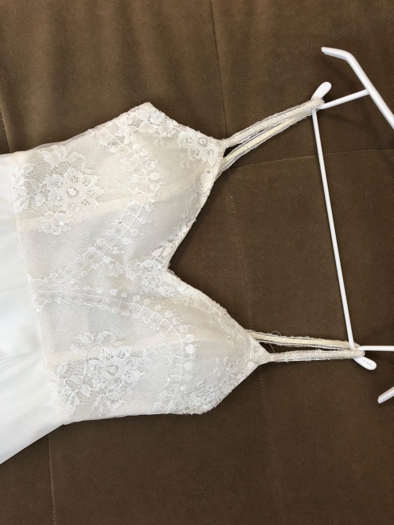 החלק העליון הינו תחרה עם חרוזים ופייטים וחצאית השמלה מעוצבת בגזרה רומית עם שסע.