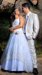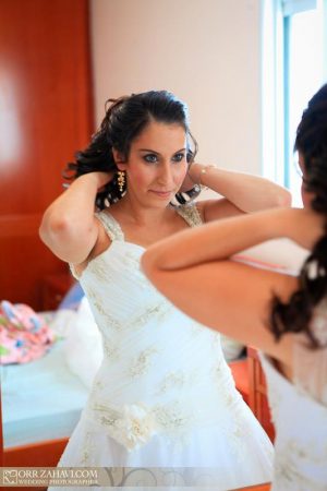 שמלה תחרה בצבע שמנת, מעט נפוחה עם מחוך, מגיעה עם חצאית חישוק והינומה. מחיר גמיש.