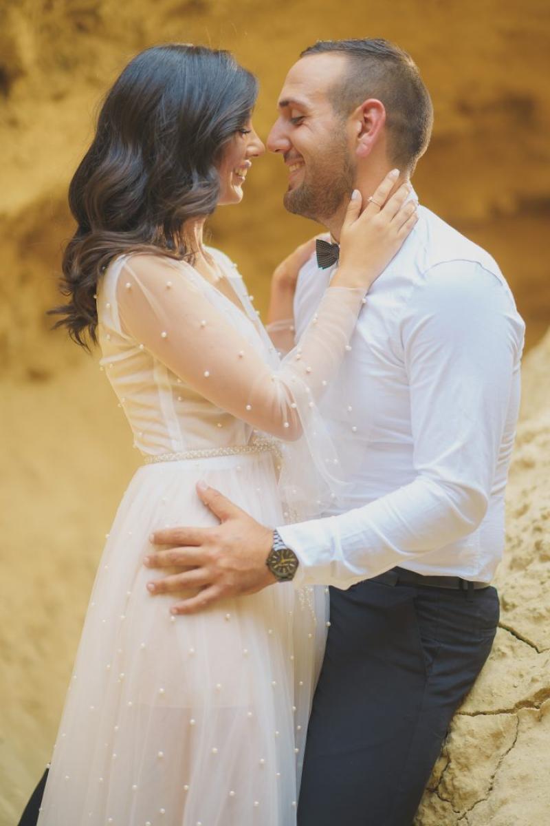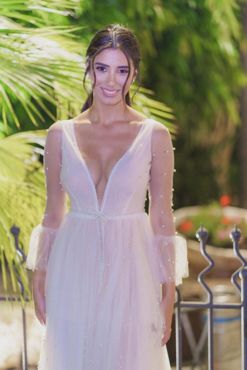 1. שמלה עדינה ויפה. בצבע שמנתי עם פנינים מבריקות.
