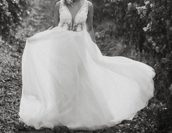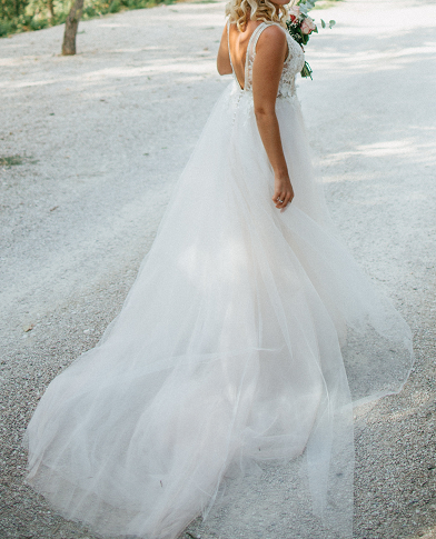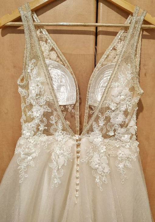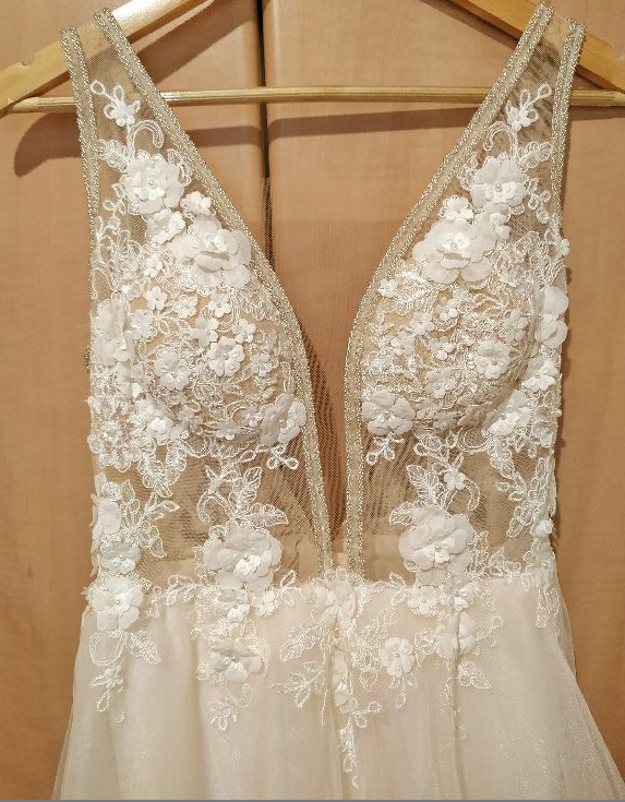 חלק קדמי בצורת V עם חרוזים ופרחים מאוד עדינים, חלק עליון עם V עמוק בגב וכפתורי פנינה.